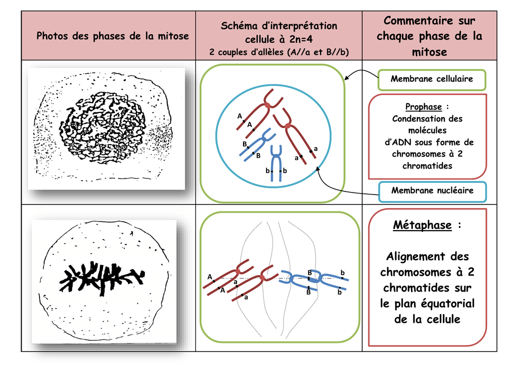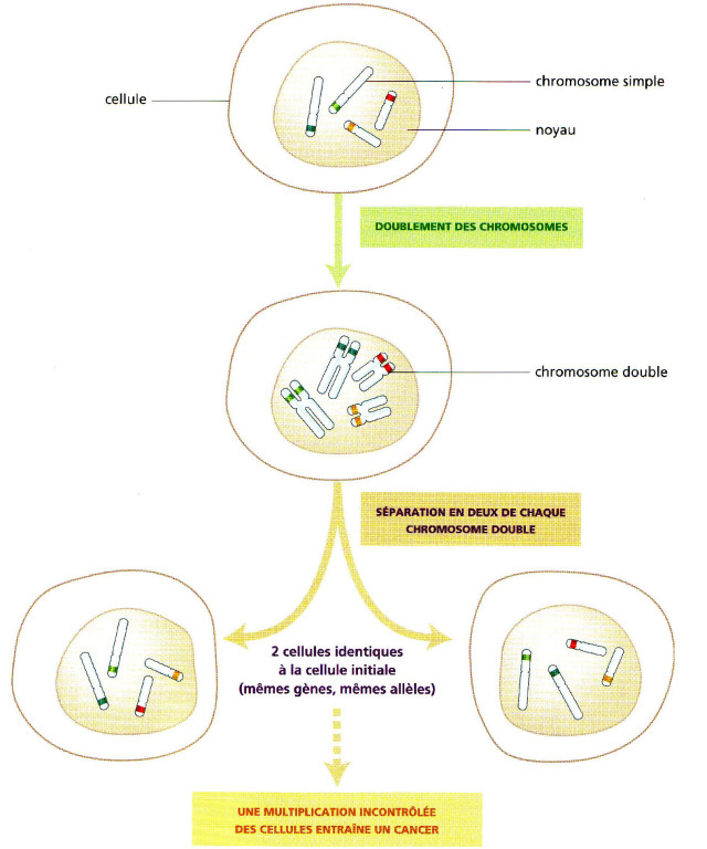 Comme vous n’êtes plus en collège, à partir du schéma ci-dessous qui a des allèles représentés par des couleurs, mettez des lettres ! La séparation des chromatides identiques de chaque chromosome conduit à deux cellules-filles identiques entre elles et à la cellule mère. La mitose est donc une division conforme.